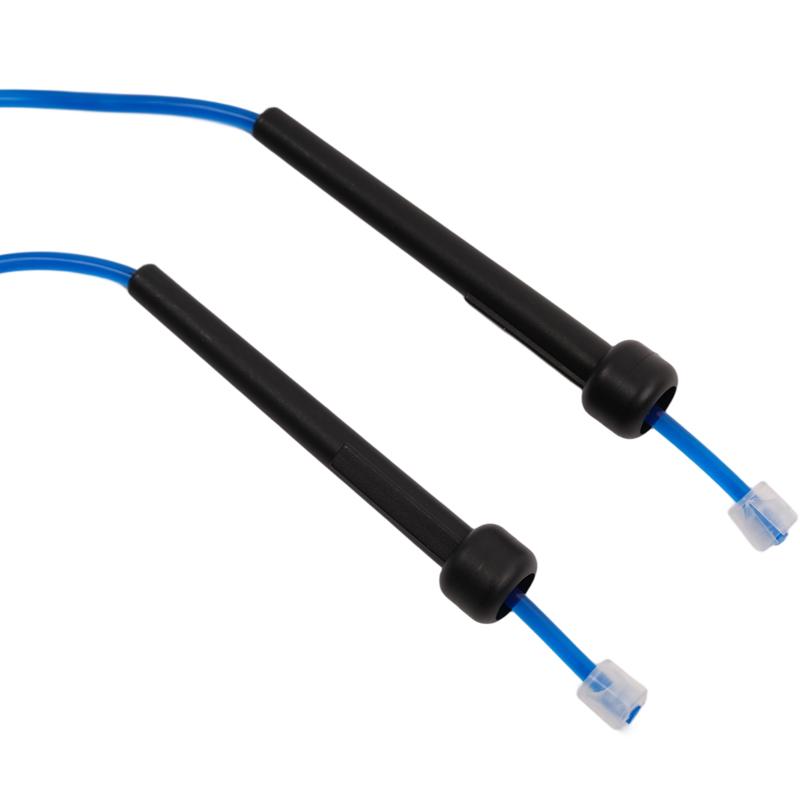 Entferne das Griff-Endstück. Zur Bestimmung der richtigen Seillänge stelle einen Fuß auf die Seilmitte und führe die Griffe am Körper entlang nach oben, sodass die Griffe bis zur Schulter reichen. Überschüssiges Seil abschneiden. Griffe zurückschieben und los geht’s!